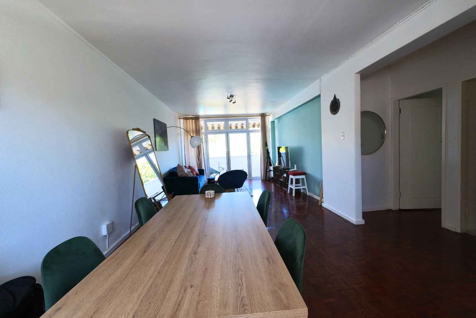 The apartment features a spacious open-plan living and dining area with elegant parquet flooring. Large stacking doors open onto a balcony with unobstructed views of Table Mountain, bringing natural light and stunning scenery into your daily life.
