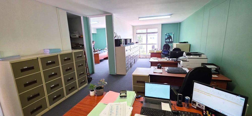 -Open plan work area with two private offices