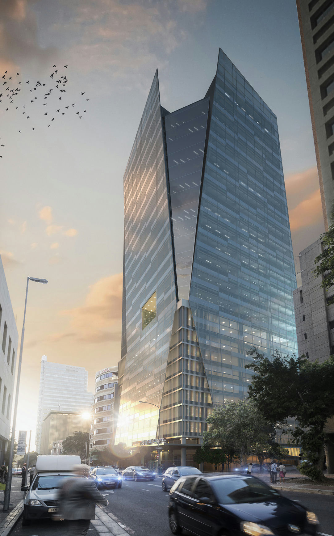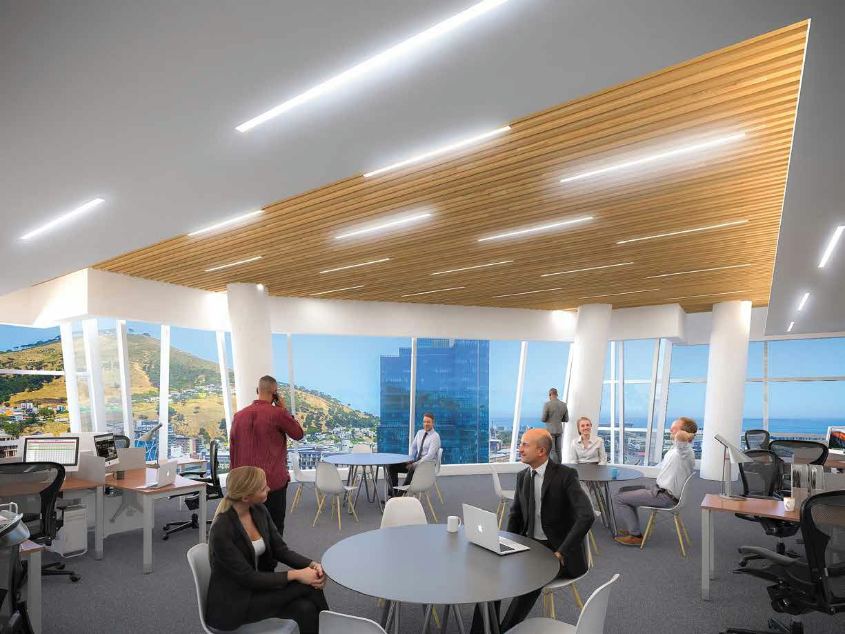 35 Lower Long, an iconic office tower epitomising Cape Town's Foreshore precinct has attracted blue chip tenants since its relaunching in 2020 incorporating a distinctive sculpted design and sleek glass facade, resembles a lively street ambience where it is found on the corner of Lower Long and Jetty Streets. 35 on Lower Long incorporates retail as well as office spaces, catering to the diverse business needs in the area. Priority has been given to activating the entire street edges of Lower Long and Jetty Street with multiple entry points and a prominent double volume entrance space. Dynamic views make 35 Lower Long a defining feature of the building across the city, both from street level and surrounding buildings. 35 Lower Long consists of 14 storeys of offices and 11 floors of parking. The top, penthouse floor offers sweeping views of Table Mountain and Cape Town Harbour.