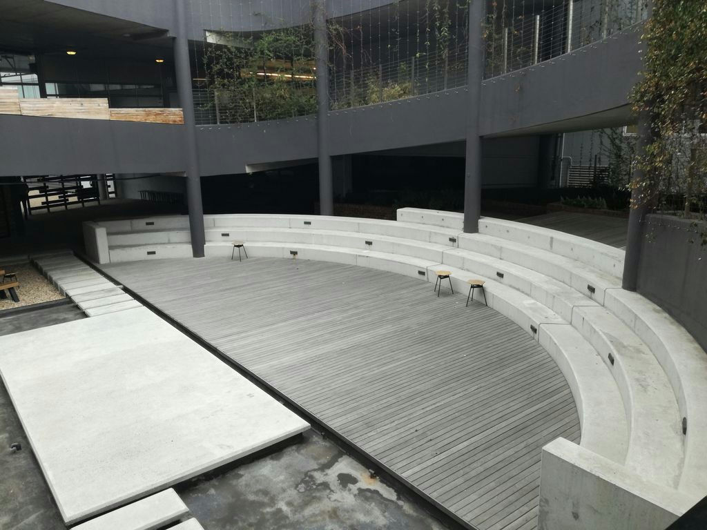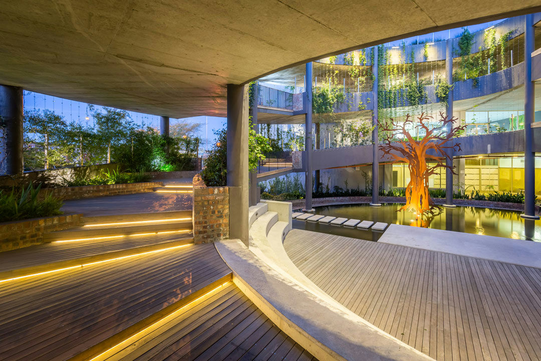 Urban Park Experience: A central landscaped urban courtyard features shaded seating areas, lunch terraces, and informal meeting zones — ideal for both relaxation and client interaction.