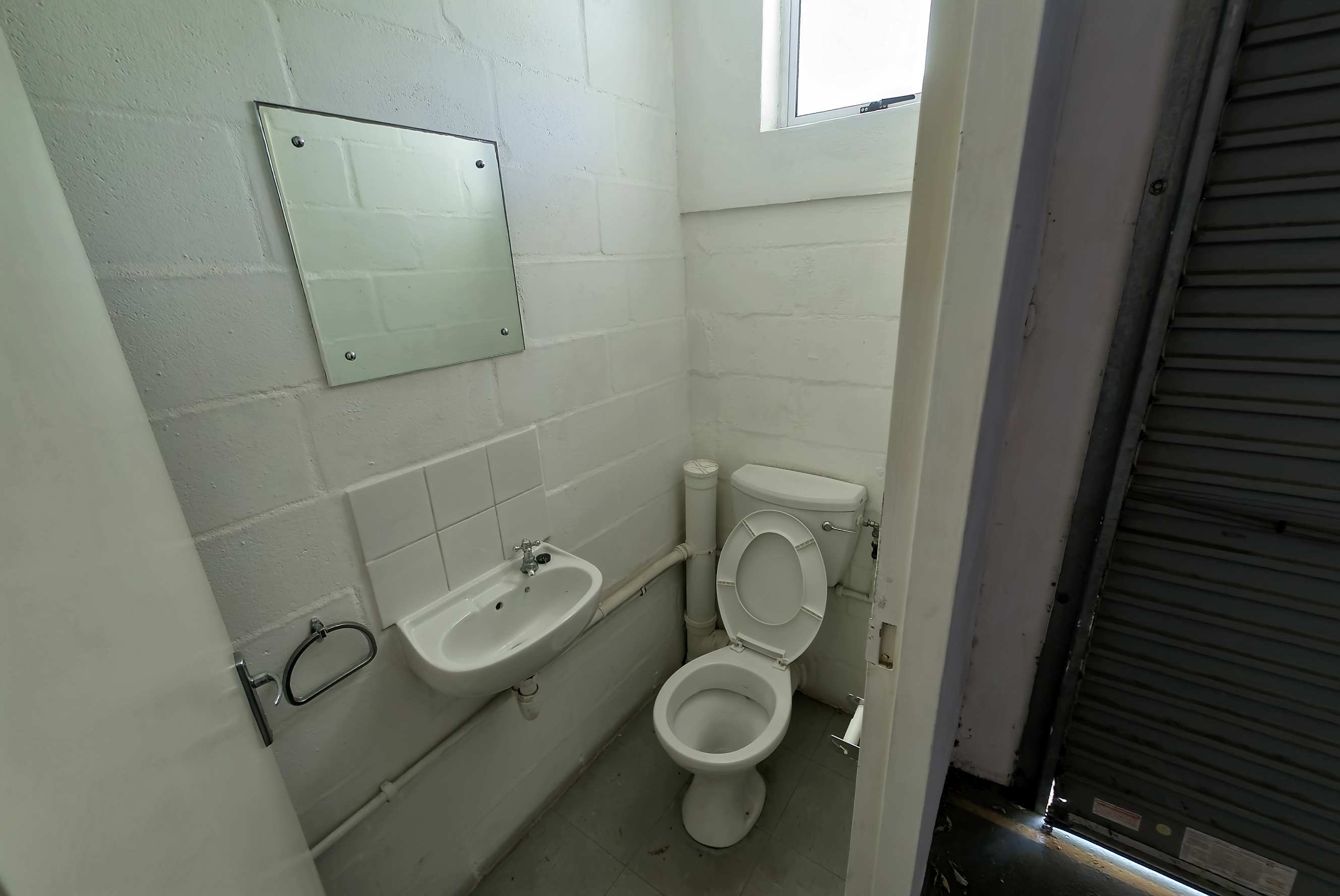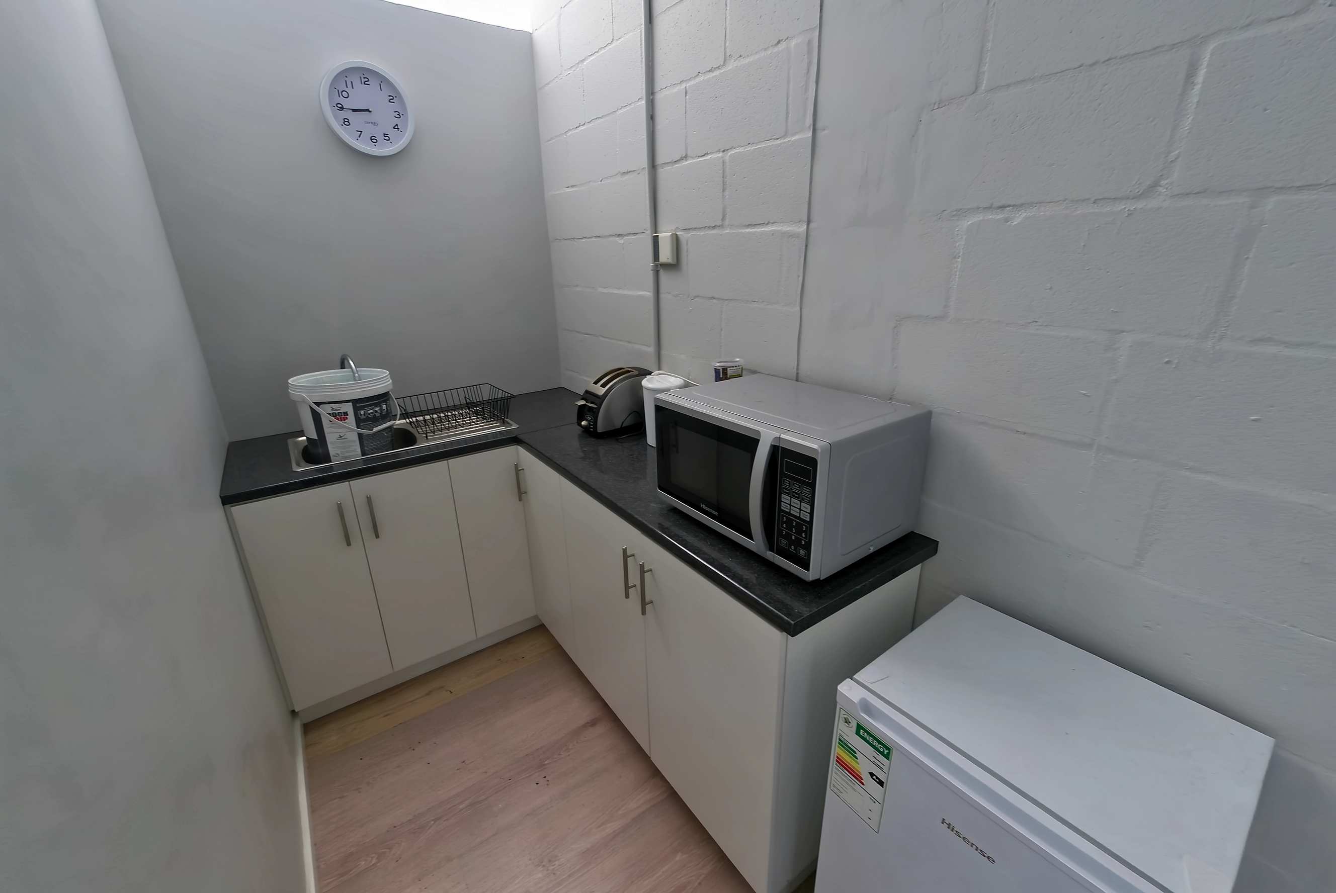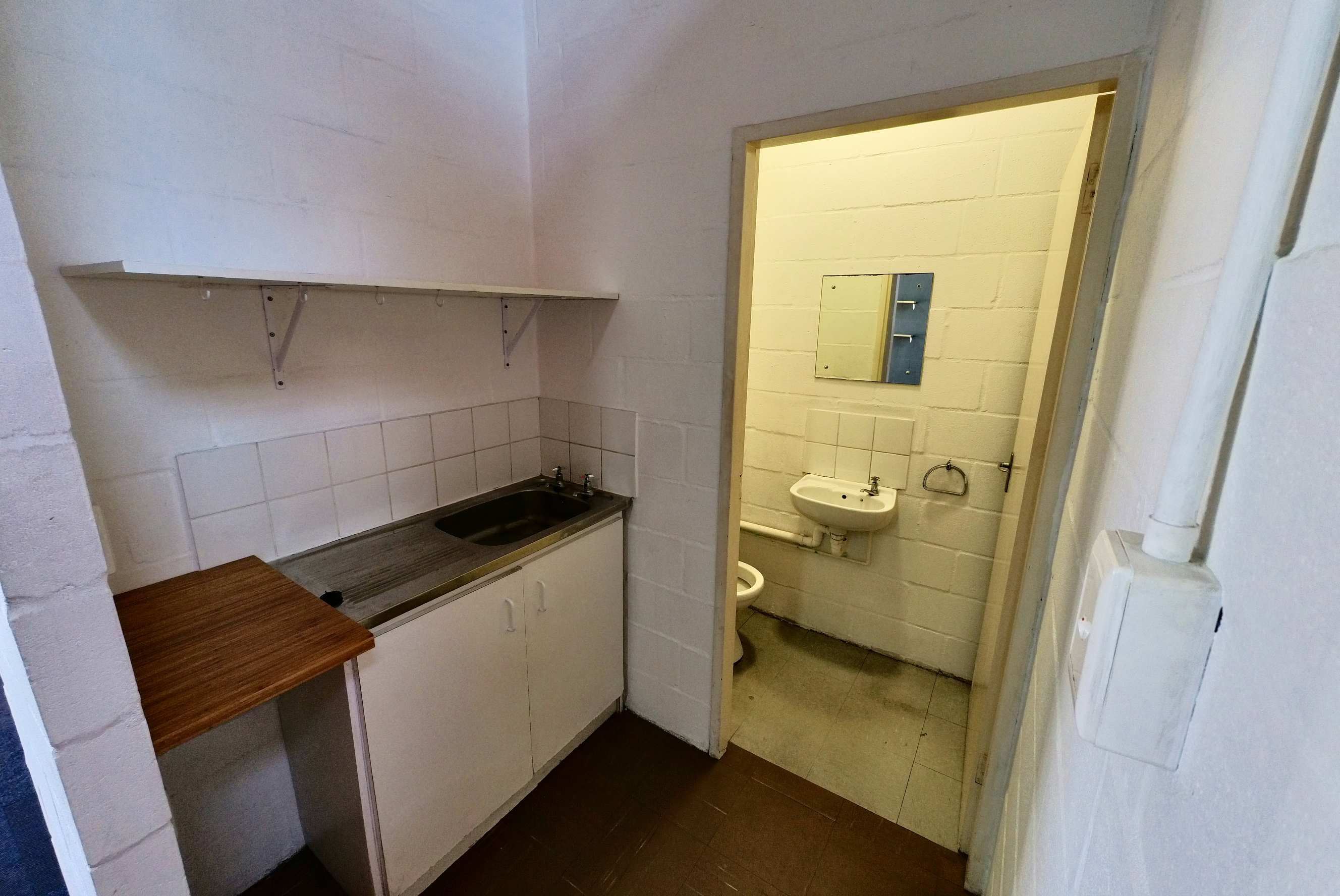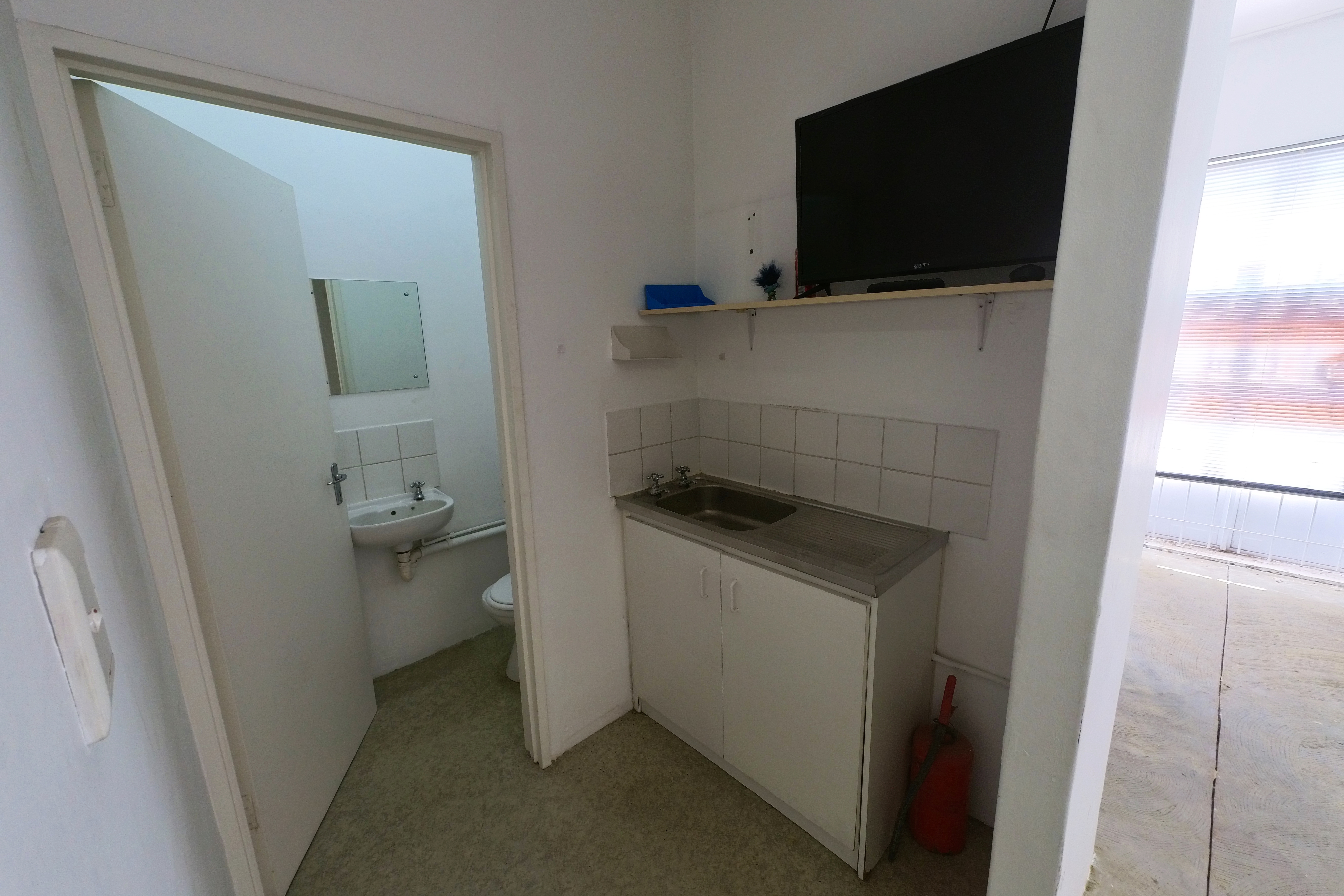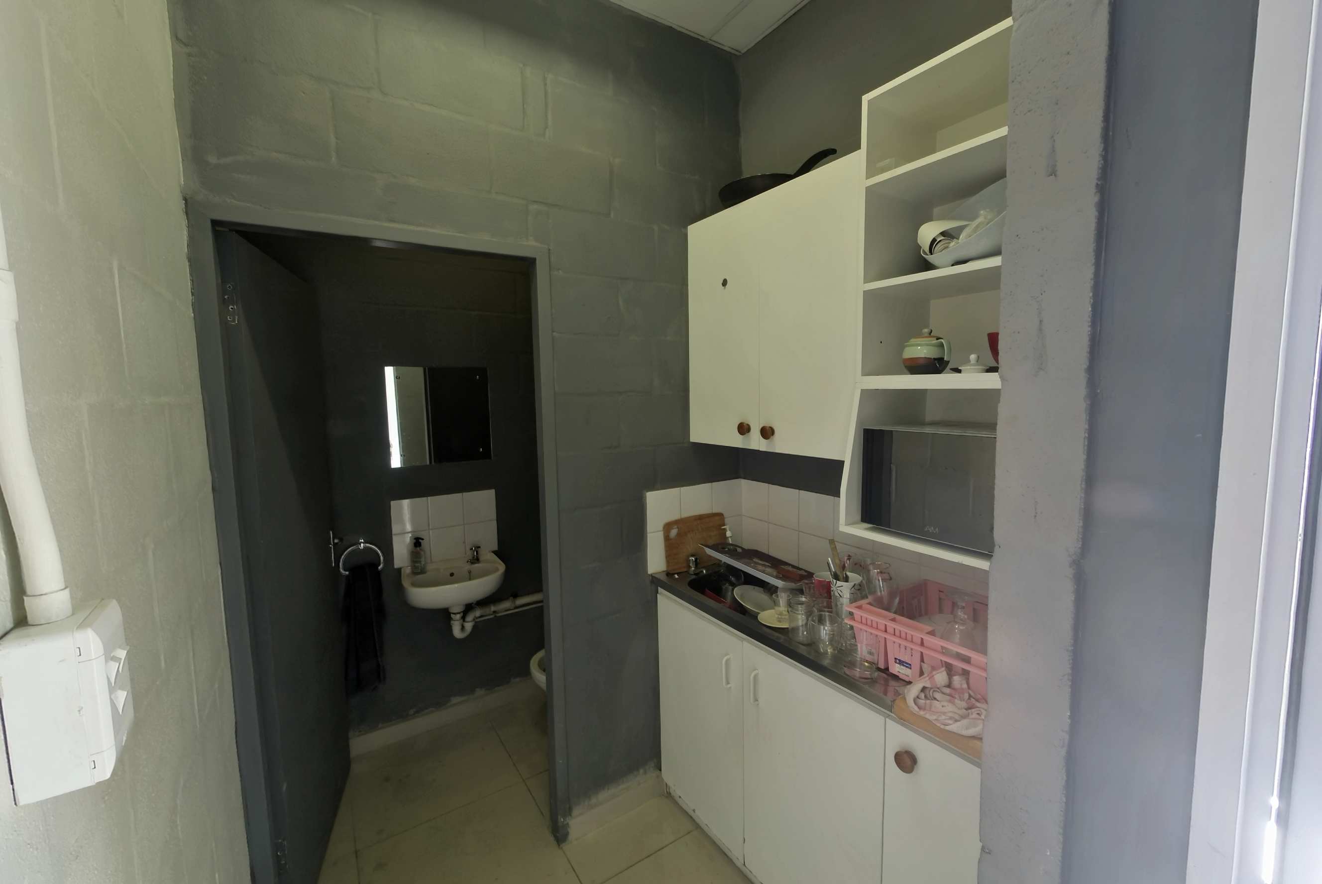 Kitchenette and two bathrooms (one in the storage section, one in the office area)