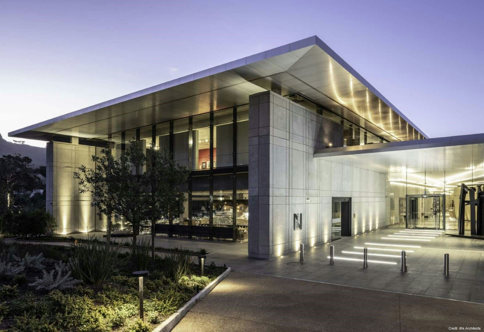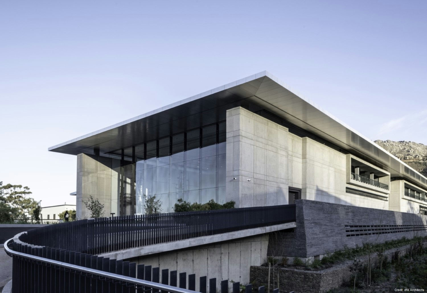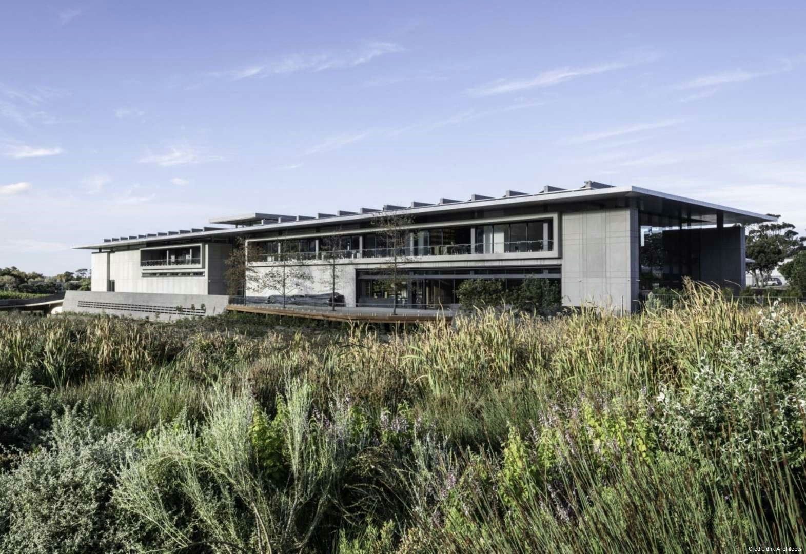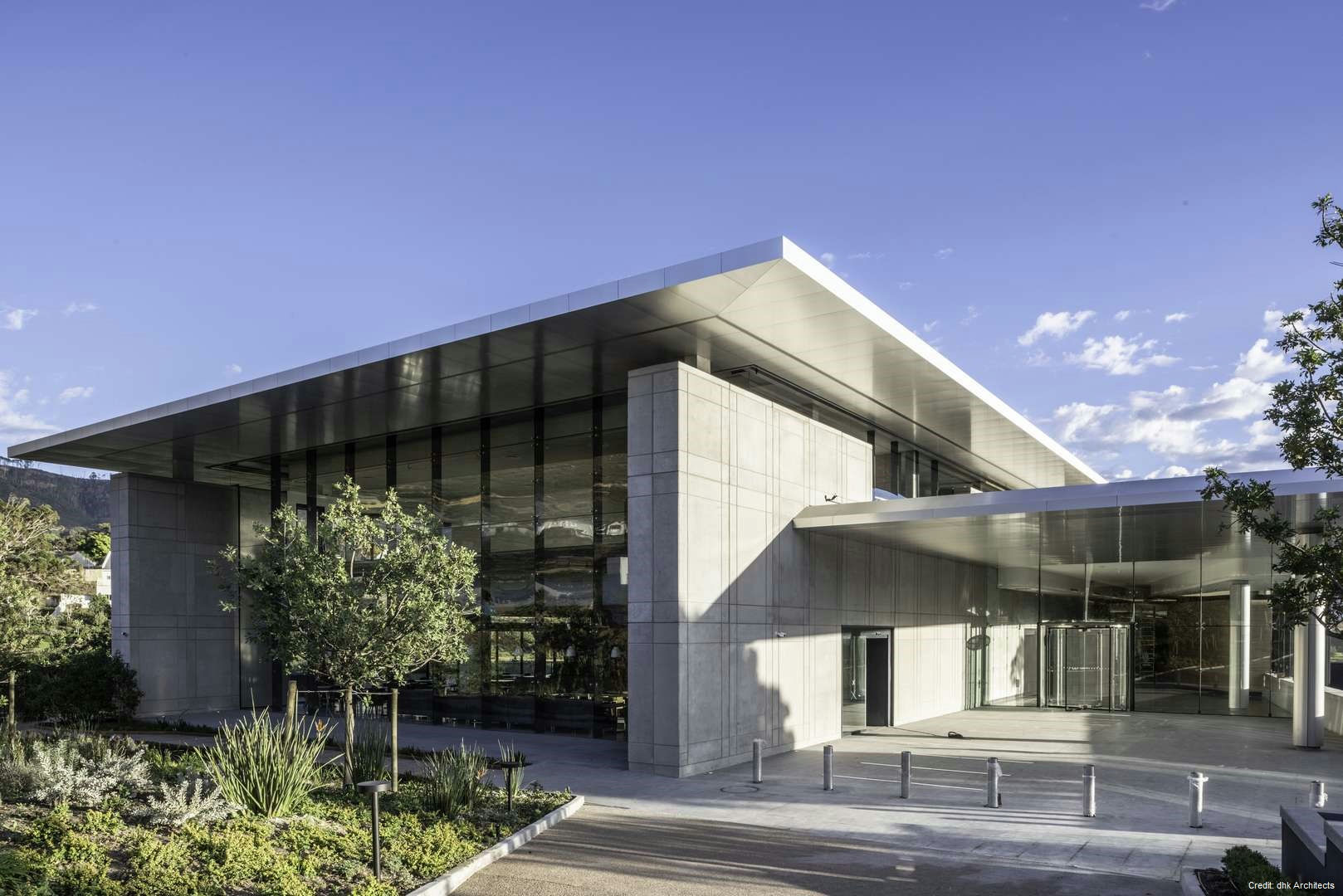 Property Details Architecture: Designed by DHK Architects, the building is a bold rectangular mass with a heavy-walled enclosure and a light over-sailing roof. The materials palette, including precast concrete, natural timber, granite, and glass, complements the natural landscape.