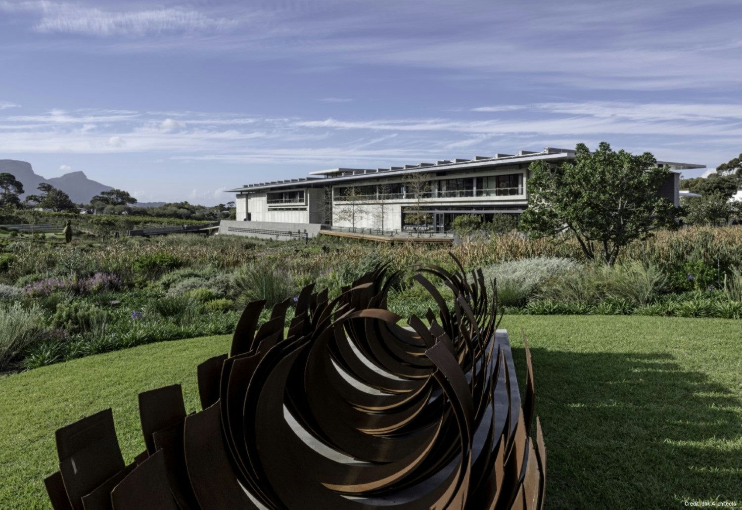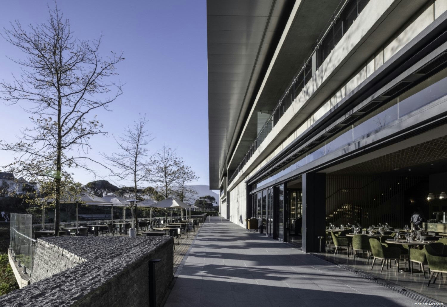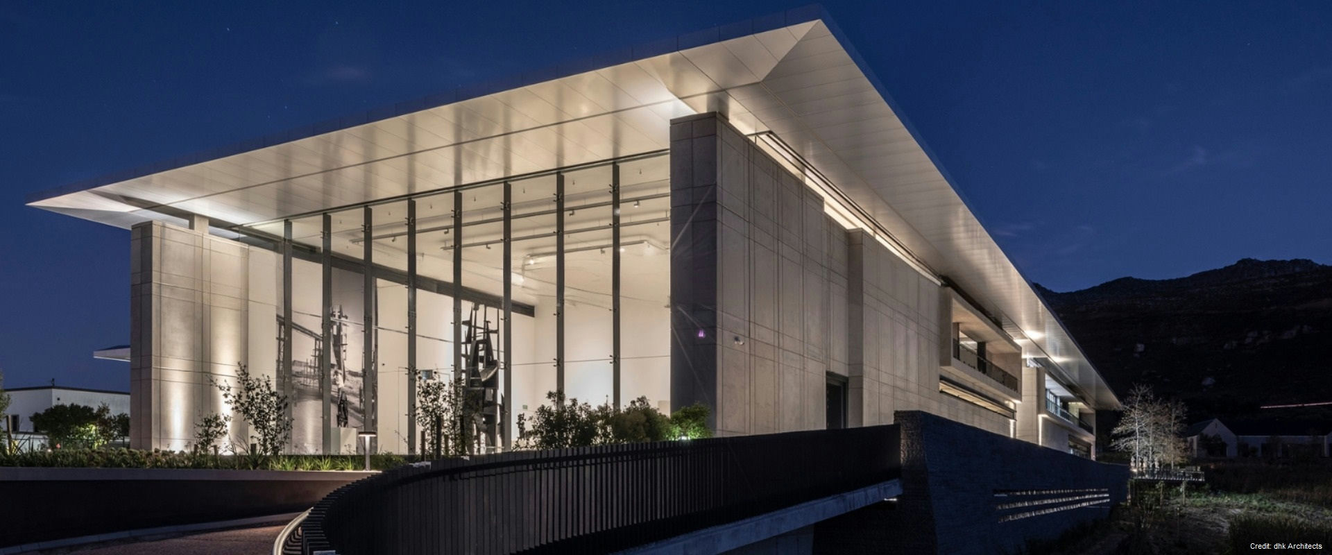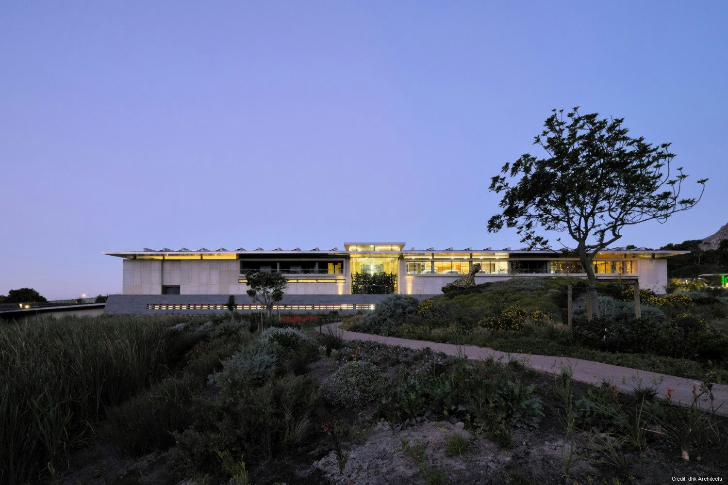 Property Details Architecture: Designed by DHK Architects, the building is a bold rectangular mass with a heavy-walled enclosure and a light over-sailing roof. The materials palette, including precast concrete, natural timber, granite, and glass, complements the natural landscape.