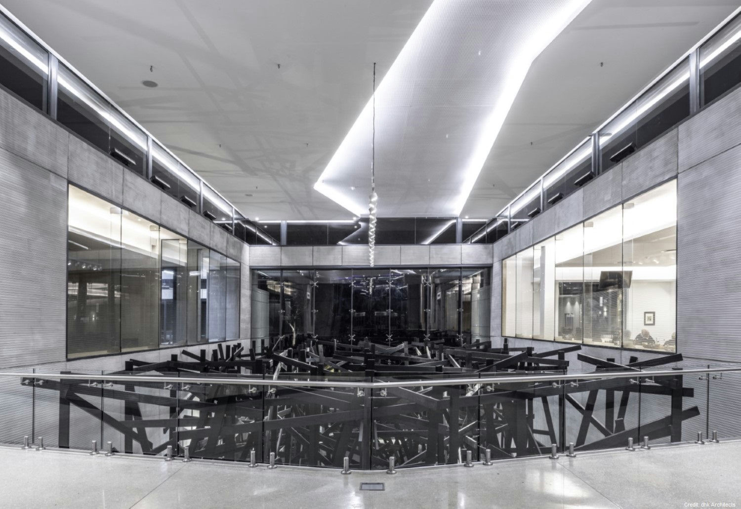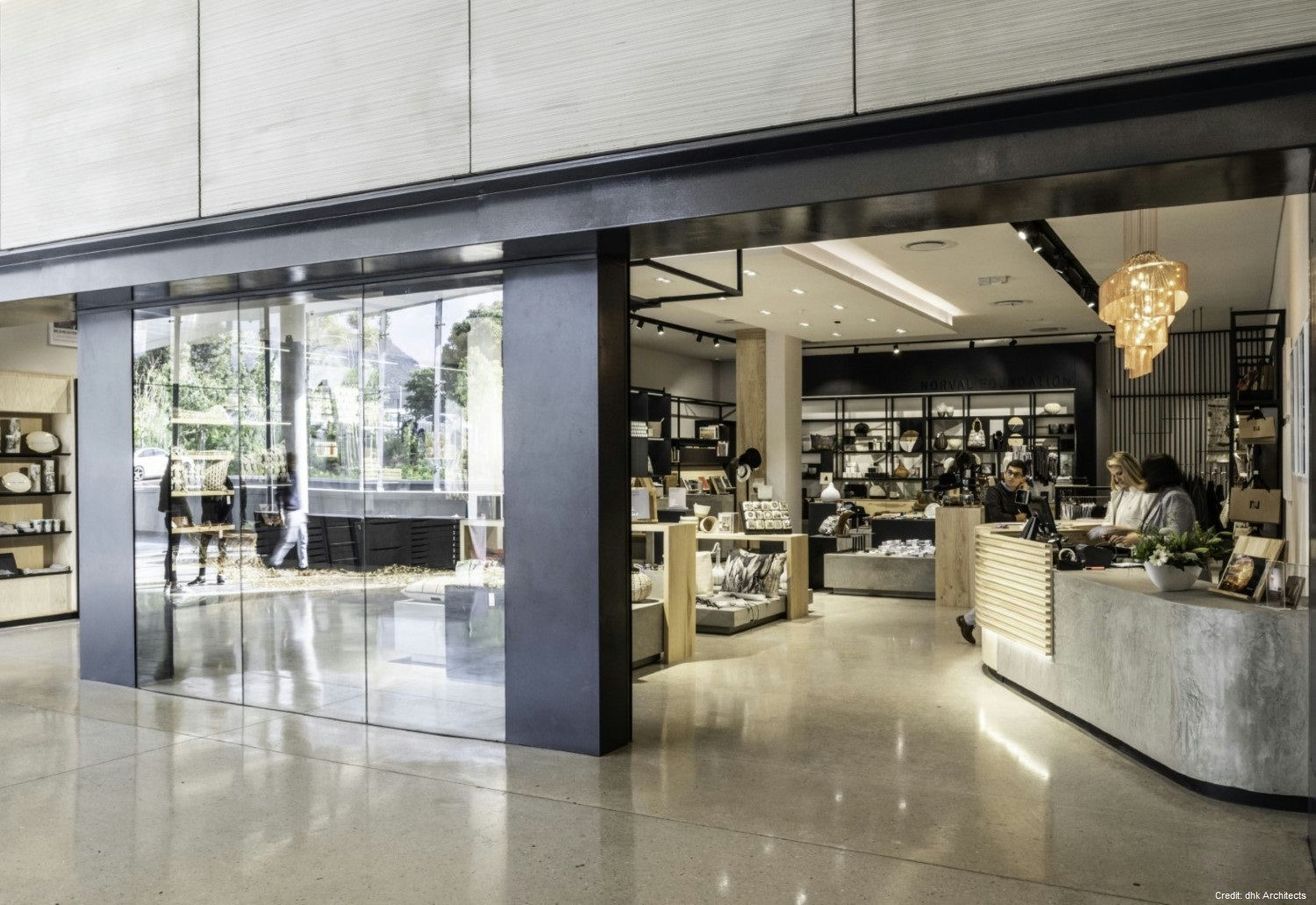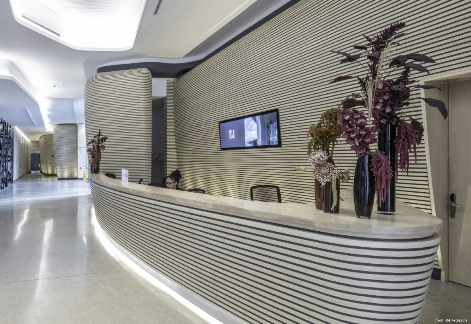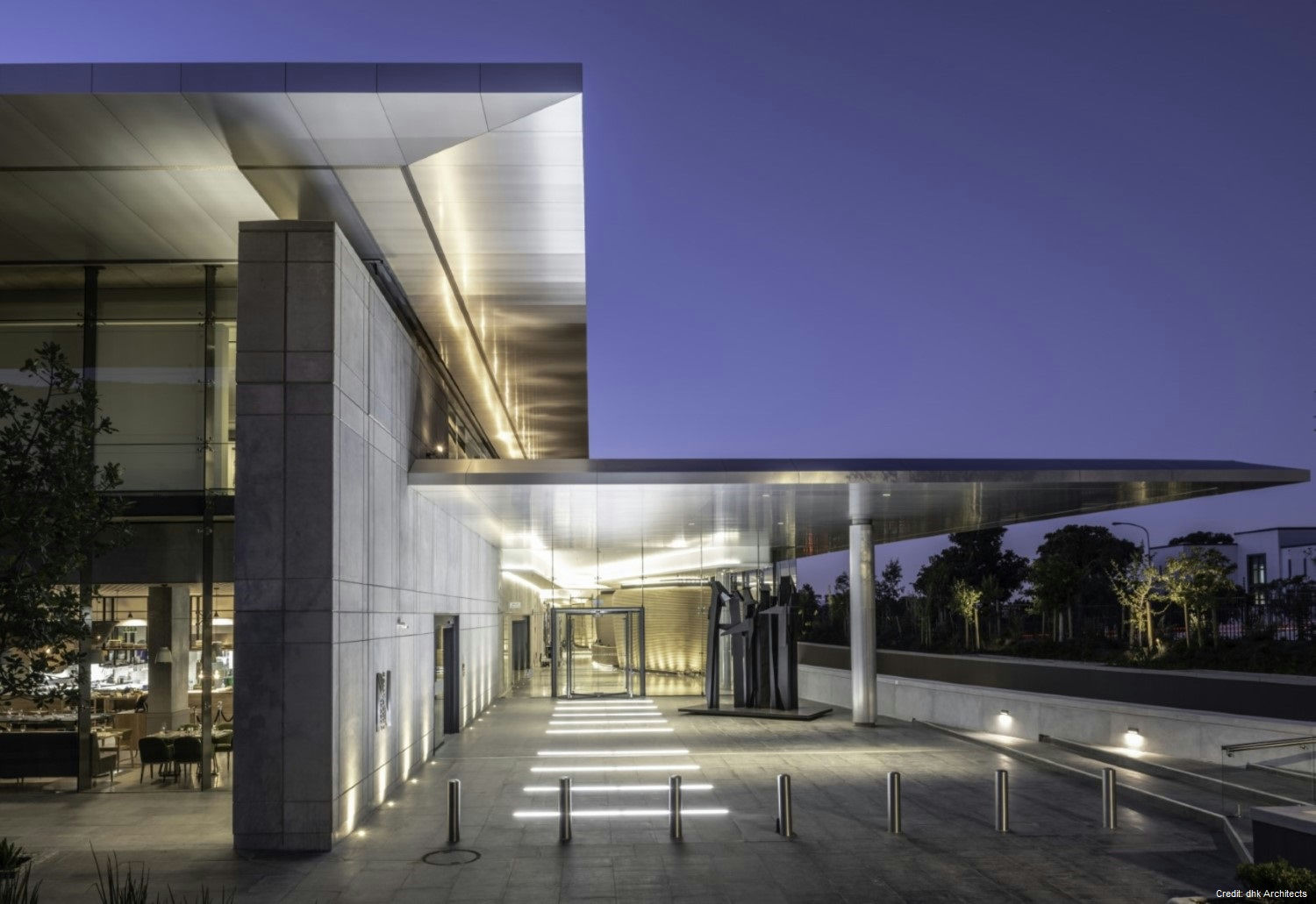 Property Details Architecture: Designed by DHK Architects, the building is a bold rectangular mass with a heavy-walled enclosure and a light over-sailing roof. The materials palette, including precast concrete, natural timber, granite, and glass, complements the natural landscape.